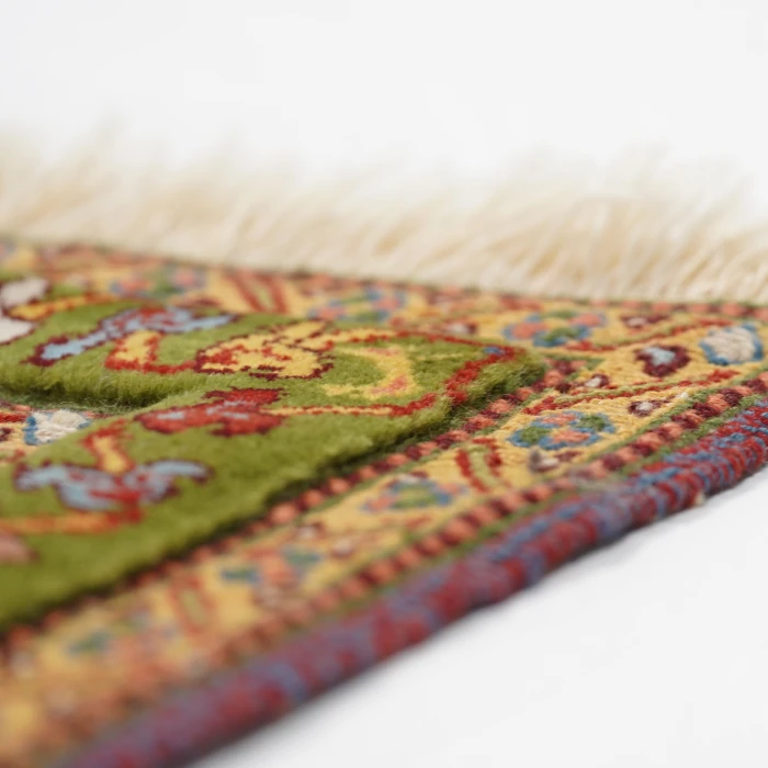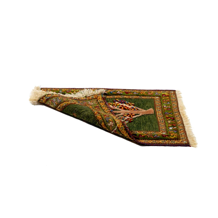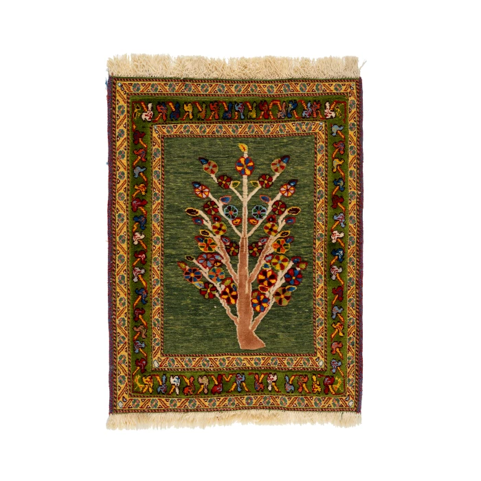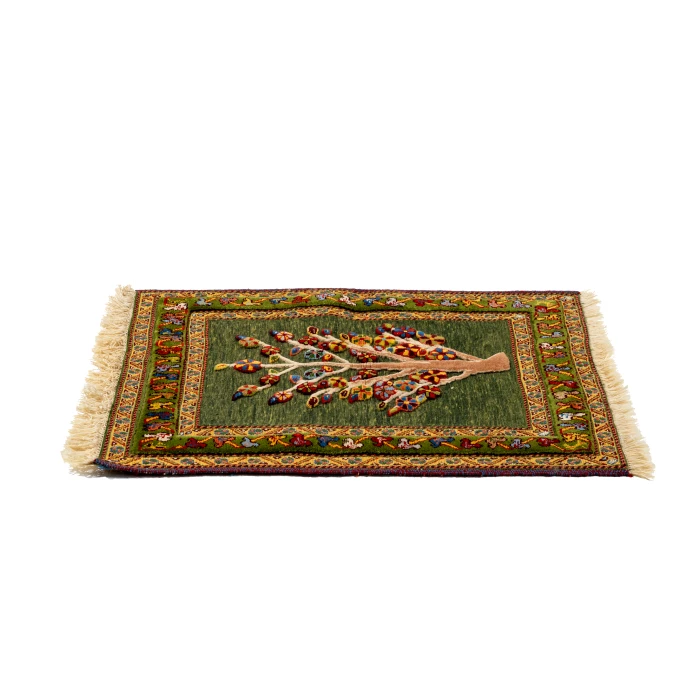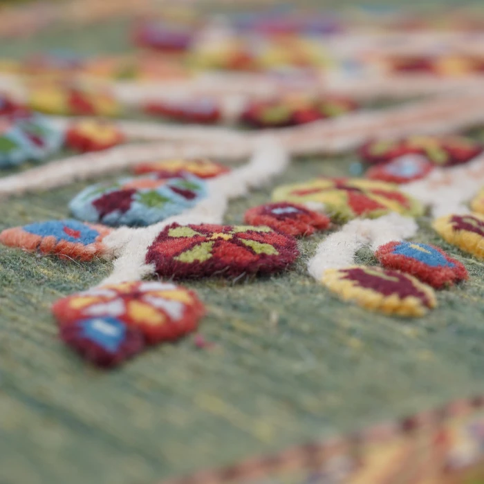 In Persian tradition, the tree is a powerful symbol of life, growth, and continuity. The green gradient background enhances this symbolism, evoking renewal and harmony with nature. By blending the durability of kilim with the elegance of carpet weaving, this piece offers both practicality for daily use and sophistication as a decorative centerpiece.