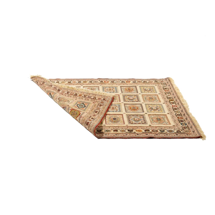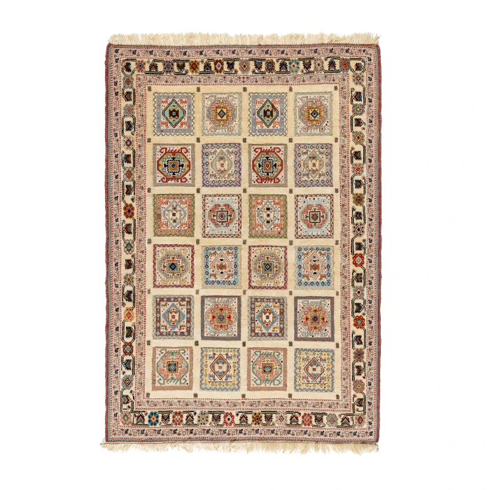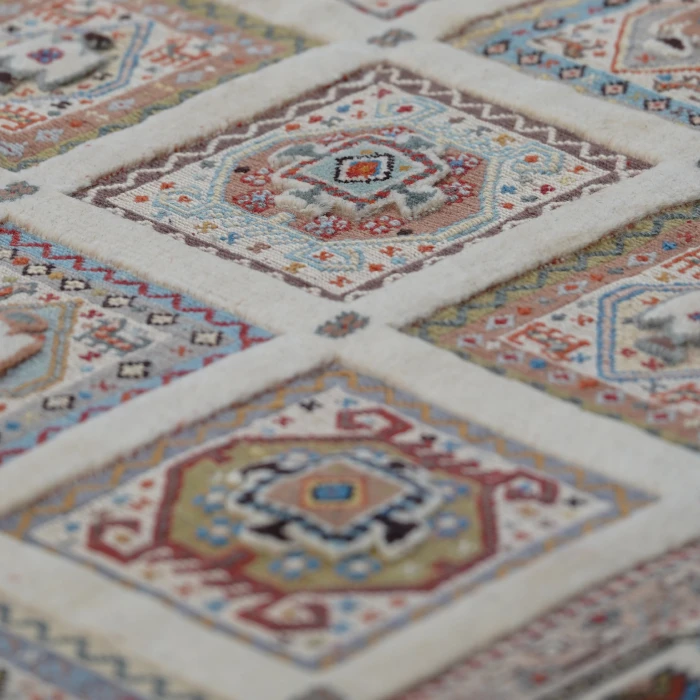 This premium kilim rug with a beige background and border is a striking example of a hybrid between kilim and carpet. Its base is handwoven in the kilim tradition, while both the central frames and the outer border are crafted in raised carpet texture, giving the rug a refined three-dimensional appearance.
